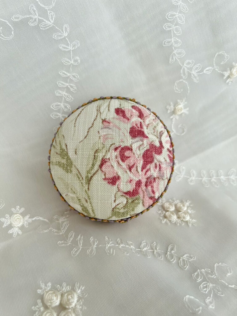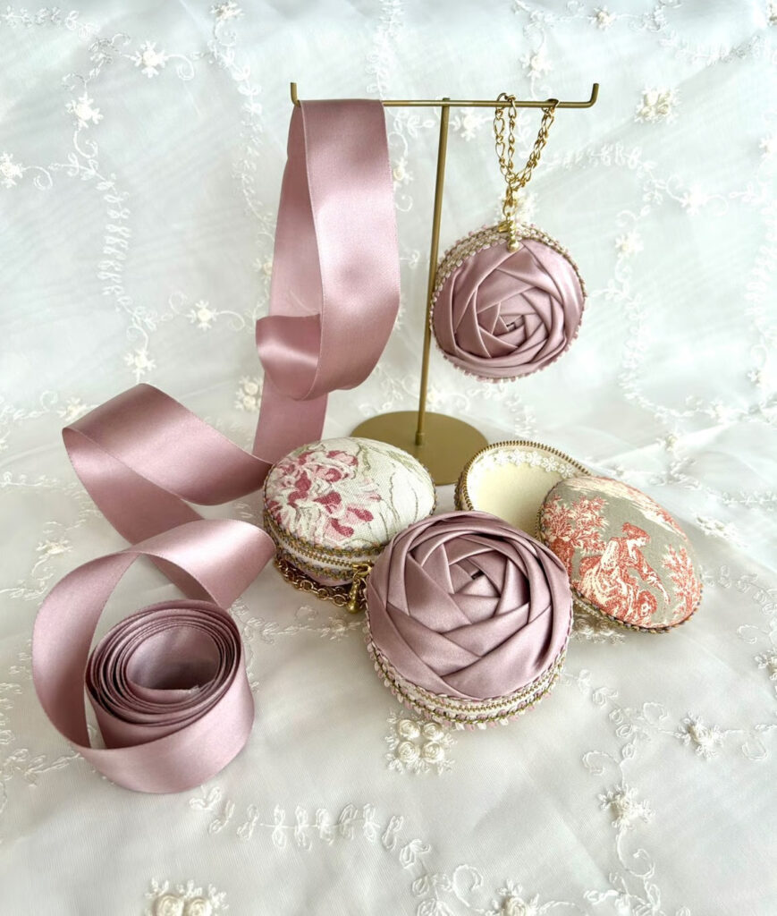 直径約8cmのマカロン型ポーチを作ります。 表面はフランス製のサテンリボンを贅沢に使い、オールドローズ(Rosa Centifolia)を作り、裏面は布を貼って、内側をクッション性のある仕様で仕上げます。 イアホンやアクセサリー入れにピッタリです。 ファスナーは縫わずに強力なグルーで接着します。 片面の布は数種類ご用意します。