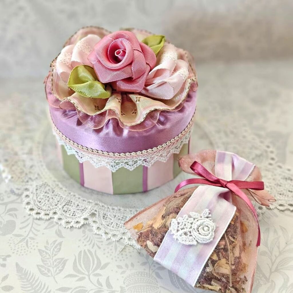 ロココカラーのフランスリボンと繊細なレースで仕立てる、華やかなポプリボックスをお作りいただきます。 ふたを開けた瞬間、ふわりと広がるのは、手作りの薔薇のポプリのやさしい香り。 見て美しく、香って癒される、暮らしを上質に彩るアイテムです。 箱はオリジナル仕様。香りを楽しめるよう、ふたにもひと工夫を施しています。 作品サイズ:直径11cm、高さ6cm